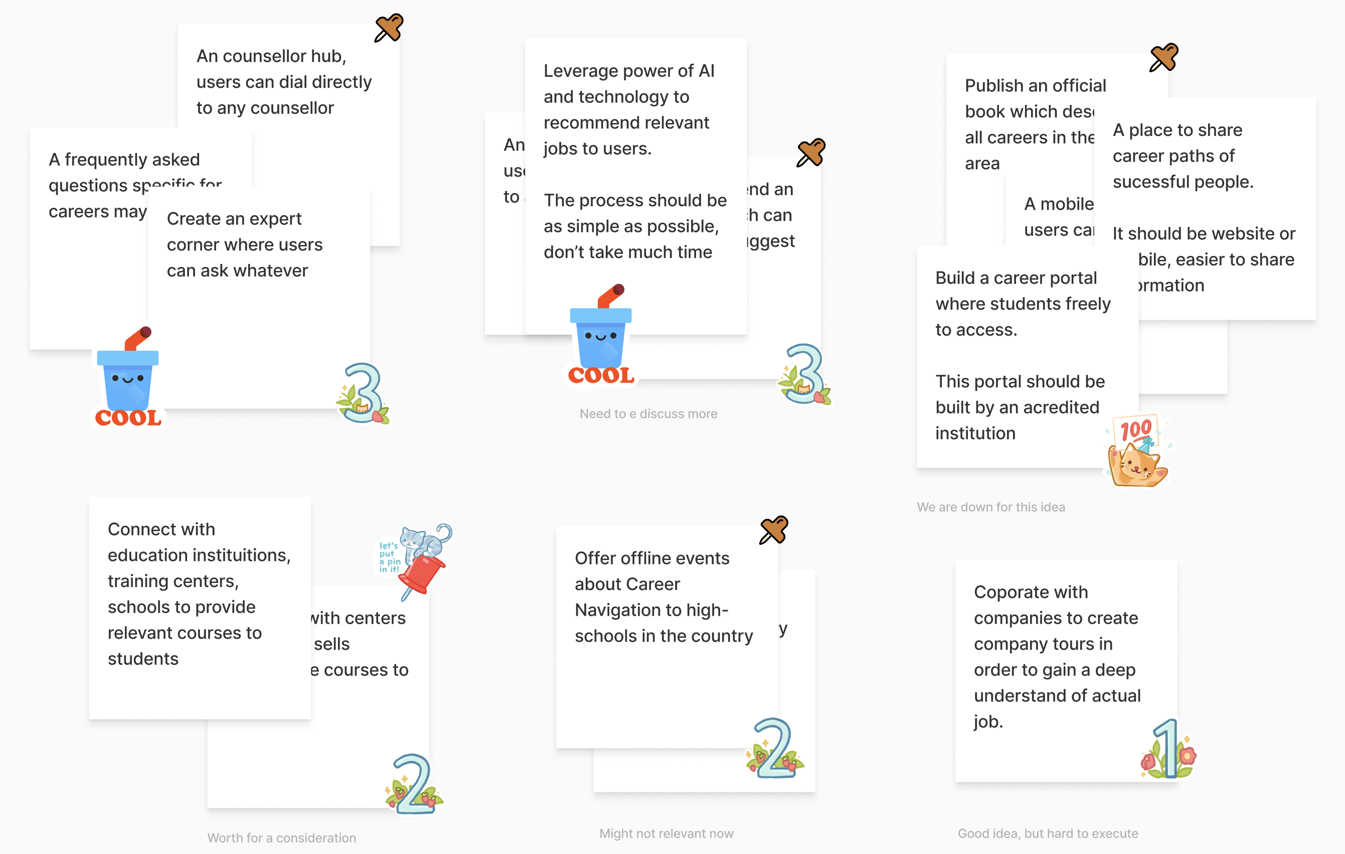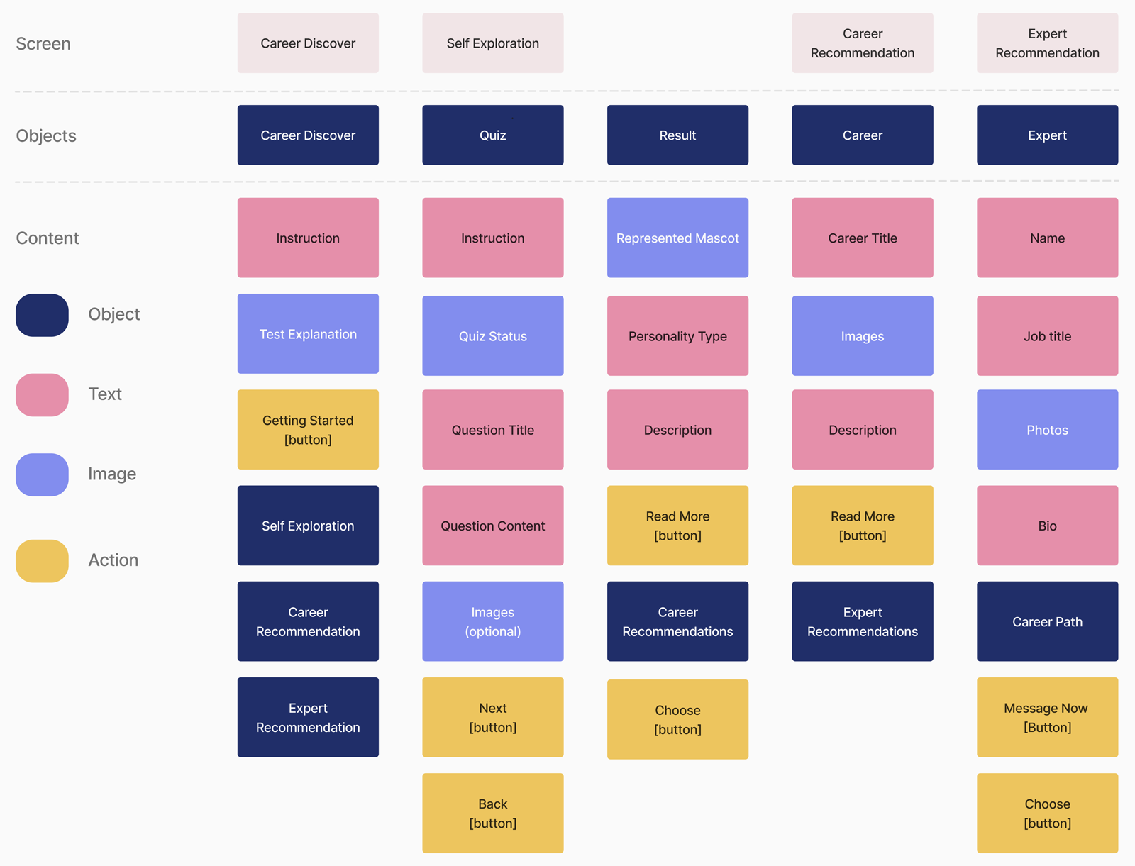 Starting with desirability, the majority of PUCO features are created using data from user research, which is obtained by using scientific research approaches like context research, user interviews, use journey maps, and UX storyboards. Additionally, performing user research provides me with practical ideas for defining and improving the product, identifying the user pain points and usability issues. These enable me to effectively justify and improve the product plans. Moreover, the theory foundation of PUCO is psychological and scientific methodologies such as Myers-Briggs Type Indicator (MBTI) methodology, The Holland Codes or Holland Occupational Themes (RIASEC) methodology, and National Careers Service Skills assessment and Job Profiles. They not only provide an important foundation for design strategy, but also assist me in creating the best product for users.