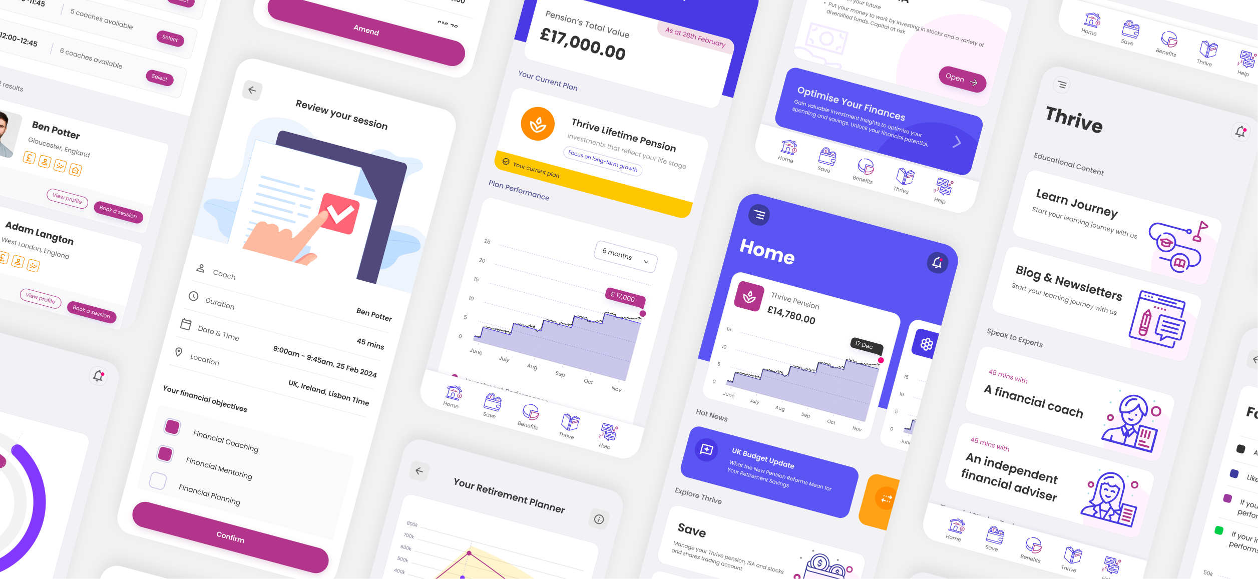 I designed Thrive UI with a mission to simplify and elevate financial experiences. Every screen, every interaction is crafted to support three powerful features: Pension Management that gives users control and clarity over retirement planning; Investment Facilitation that guides smart decisions with accessible tools; and Financial Coaching that delivers tailored advice right when it’s needed.